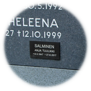 Mikäli hautakiveen ei enää mahdu lisänimeä kaivertamalla tai kiveen halutaan jättää vielä tilaa useammille nimitiedoille, voi nimen lisäämisen toteuttaa laatalla. Kauttamme on saatavilla runsas valikoima erilaisia pronssi- ja messinkilaattoja. Suosittelemme mielellämme kiveenne sopivaa laattaa.